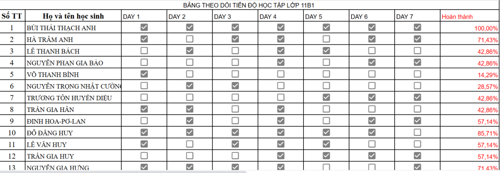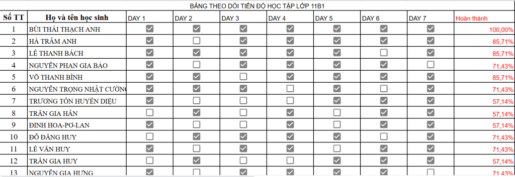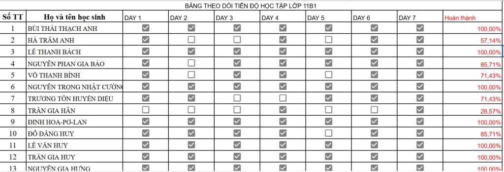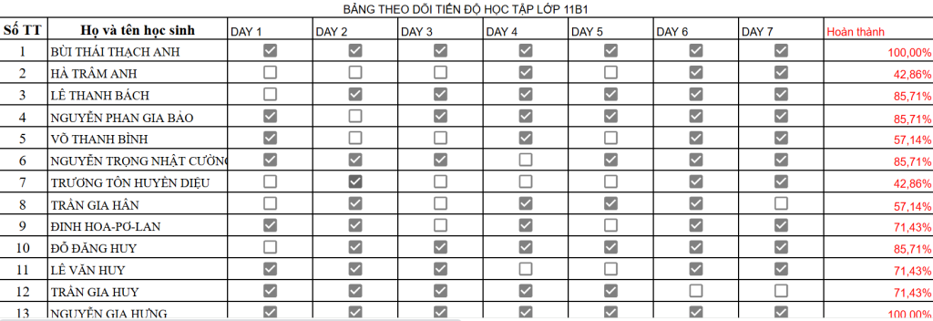 📊 Bảng theo dõi tiến độ học tập lớp 11B1 - TUẦN 16