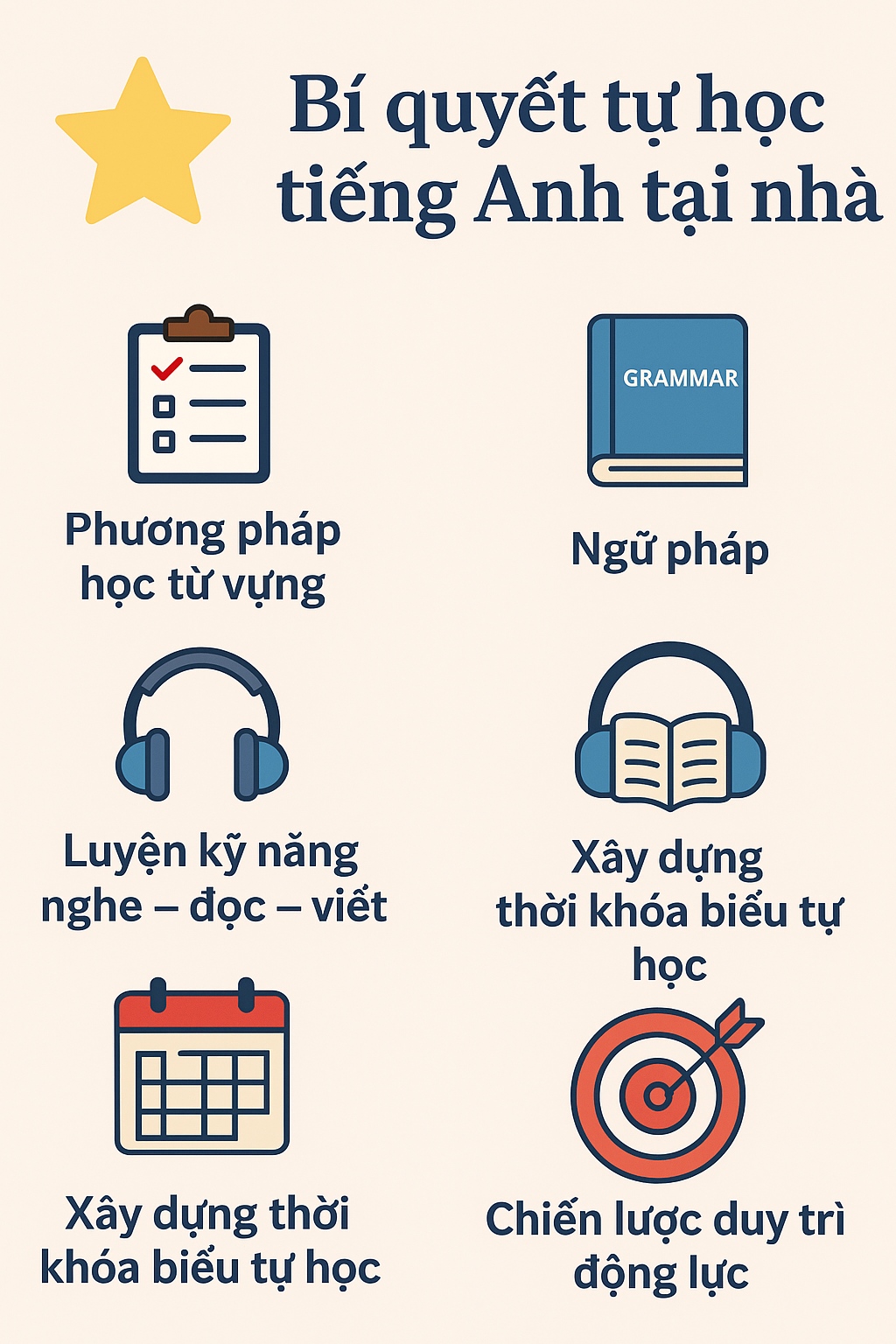 Trước hết, mục này trình bày các phương pháp ghi nhớ từ vựng theo hướng tối ưu hóa khả năng tiếp thu, như hệ thống hóa theo chủ đề, sử dụng thẻ từ (flashcard) và áp dụng kỹ thuật lặp lại ngắt quãng (spaced repetition). Phần ngữ pháp được thiết kế theo hướng tinh gọn, kết hợp sơ đồ tư duy và ví dụ minh họa nhằm hỗ trợ người học nắm bắt cấu trúc nhanh và chính xác.